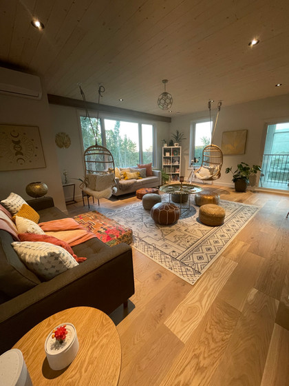 Salon Joya (Chaises supsendues et divans, foyer 4-faces, mezzanine de l’Oasis avec balançoires de méditation)